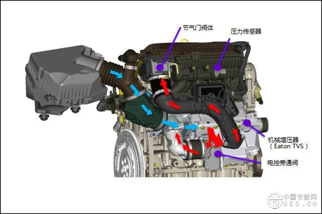 機械增壓發(fā)動機進氣通道通過上圖可以了解,藍色箭頭表示空氣流經機械增壓器之前的過程,紅色箭頭表示空氣流經機械增壓器之后的過程。整個進氣布局相比廢氣渦輪增壓發(fā)動機要簡單不少。