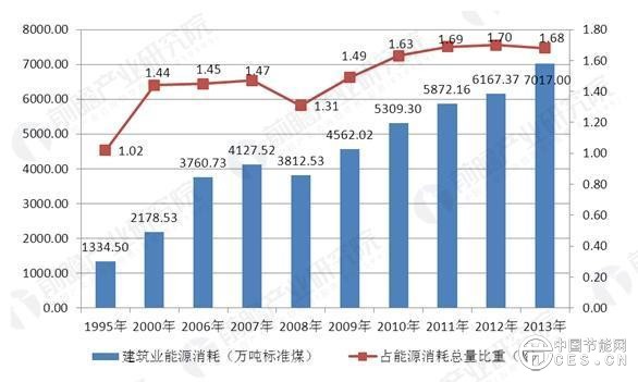 在此背景下,我國建筑行業(yè)能源消耗不斷增長,2013年為7017萬噸標準煤,較1995年的1334.50萬噸標準煤增長5倍,雖然建筑業(yè)整體消耗占比較低,但從其占總能源消耗的比重來看,建筑行業(yè)能源消耗占比總體呈上升趨勢,由1995年的1.02%上升至2013年的1.68%。