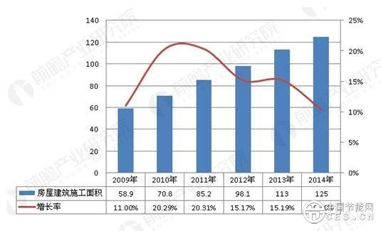 2009-2014年我國建筑業(yè)房屋建筑施工面積及同比增速(單位:億平方米,%)
