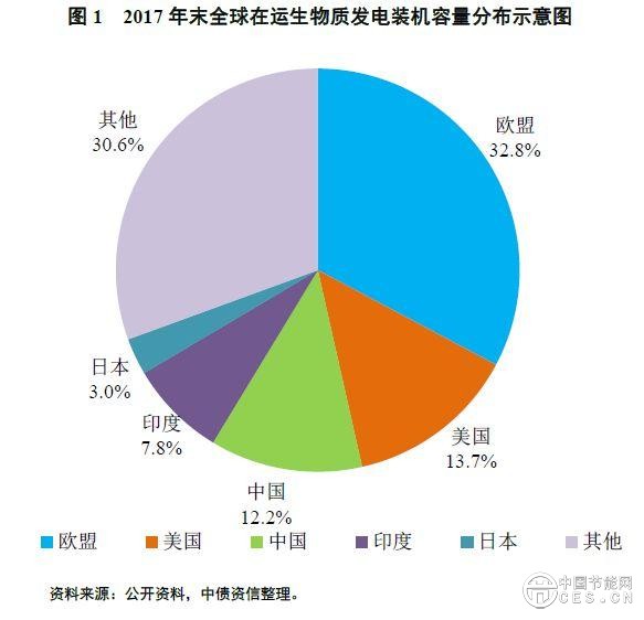 根據(jù)全球可再生能源網(wǎng)絡(luò)REN21發(fā)布的《2018年可再生能源現(xiàn)狀報告》所披露的數(shù)據(jù),2017年全球新增生物質(zhì)發(fā)電810萬千瓦,到2017年底全球在運生物質(zhì)發(fā)電裝機容量1.22億千瓦,其中歐盟4,000萬千瓦、美國1,670萬千瓦、中國1,490萬千瓦、印度950萬千瓦、日本360萬千瓦。從全球范圍看,歐盟地區(qū)的裝機規(guī)模最大,這也與生物質(zhì)發(fā)電項目在歐盟興起有很大關(guān)聯(lián);歐盟、美國和中國的合并裝機規(guī)模占全球總規(guī)模的58.7%。