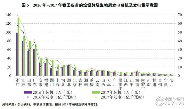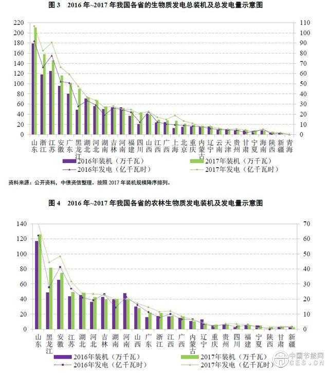 截至2017年底,全國共有30個省(區(qū)、市)投產(chǎn)了747個生物質(zhì)發(fā)電項目,并網(wǎng)裝機容量1,476.2萬千瓦(不含自備電廠),占全國電力裝機容量的0.6%,占可再生能源發(fā)電裝機容量的2.3%,占非水可再生能源發(fā)電裝機容量的4.8%。2017年發(fā)電量794.5億千瓦時,占全部發(fā)電量的1.2%,占可再生能源發(fā)電量的4.7%,占非水可再生能源發(fā)電量的15.8%。其中農(nóng)林生物質(zhì)發(fā)電項目271個,累計并網(wǎng)裝機700.9萬千瓦,年發(fā)電量397.3億千瓦時;生活垃圾焚燒發(fā)電項目339個,累計并網(wǎng)裝機725.3萬千瓦,年發(fā)電量375.2億千瓦時;沼氣發(fā)電項目137個,累計并網(wǎng)裝機50.0萬千瓦,年發(fā)電量22.0億千瓦時。生物質(zhì)發(fā)電累計并網(wǎng)裝機排名前四位的省份是山東、浙江、江蘇和安徽,分別為210.7萬、158.0萬、145.9萬和116.3萬千瓦;年發(fā)電量排名前四位的省份是山東、江蘇、浙江和安徽,分別是106.5億、90.5億、82.4億和66.2億千瓦時。