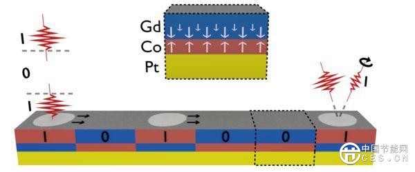 如下圖所示:全光開關(guān)。數(shù)據(jù)以“比特位”的形式存儲,這些比特位包含數(shù)字“0(北極向下)”和“1(北極向上)”。數(shù)據(jù)的寫入是通過采用超短激光脈沖(紅色)“切換”兩極的方向來實現(xiàn)的。