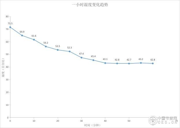 可以看出,最后5個(gè)濕度數(shù)值幾乎就相差不多了,說(shuō)明當(dāng)空氣濕度下降到43%后除濕機(jī)就智能地進(jìn)入維持狀態(tài),這時(shí)候室內(nèi)空氣濕度在一個(gè)最舒適的程度,再低就需要加濕了。