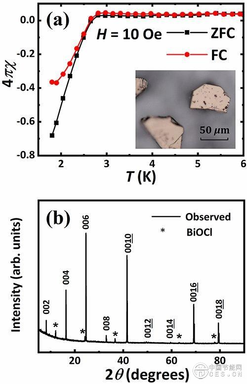 圖3. Bi3O2S2Cl單晶樣品的超導(dǎo)電性與XRD衍射圖譜