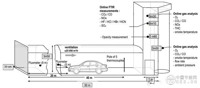 汽車燃燒實驗在INERIS所有的如圖1所示的裝置中進行,實驗總體設置如圖2所示。該裝置長50 m、高3.5 m、寬3 m,氣體檢測單元布置在10 m高的塔樓中。裝置帶通風系統(tǒng)和氣體凈化系統(tǒng),能確保最終排放到大氣中的氣體是無害的。除了在線檢測燃燒氣體成分外,還離線對燃燒產(chǎn)生的顆粒物和重量變化進行了分析。實驗所用的兩家法國企業(yè)生產(chǎn)的燃油車和電動車具體信息未給出,特別是電動車所用的動力電池的化學體系。