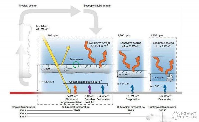 按照這樣的預計,科學家們認為,目前的氣候變化模型顯示除非我們大幅減少向大氣中注入的溫室氣體,否則全球氣溫將上升大約4攝氏度。而另一項研究則給出了更為驚悚的答案,隨著地球大氣層中二氧化碳濃度的劇烈增加,通過長波輻射與水汽反饋,導致淺層對流的抑制和云層高度處大氣層結穩(wěn)定性下降,使地球表面廣泛存在的層積云消散轉化為碎積云,會導致地球表面反照率顯著下降與進一步升溫。也就是說,這個反饋過程導致地球會在原有溫室效應增溫的基礎上再度增溫,增溫幅度最大可以達到8度,也就是說,當全球二氧化碳真達到了“古新世-始新世極熱事件”以來從未達到的二氧化碳水平,全球總變暖水平可能超過10度!這將是災難性的。