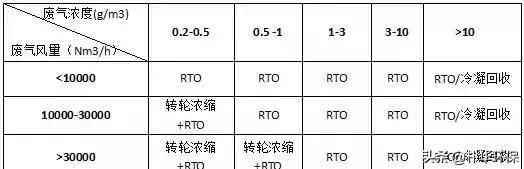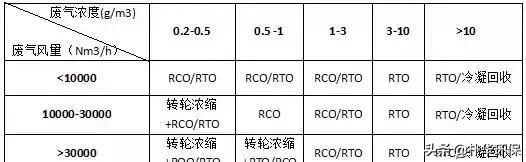 在廢氣風(fēng)量、廢氣濃度和成分知曉的情況下,可以選擇相應(yīng)的處理方式,可以參照下表進(jìn)行選擇(僅供參考):