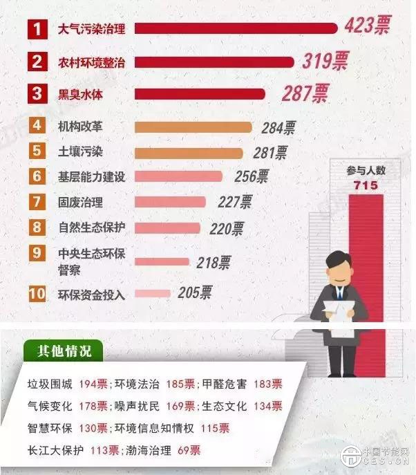 粉絲最關心的10個議題中,大氣污染治理以423票的結果穩(wěn)穩(wěn)排在了第一位;農村環(huán)境整治位列第二,獲319票;接下來分別是黑臭水體、機構改 革、土壤污染、基層能力建設、固廢治理、自然生態(tài)保護、中央生態(tài)環(huán)保督察和環(huán)保資金投入。