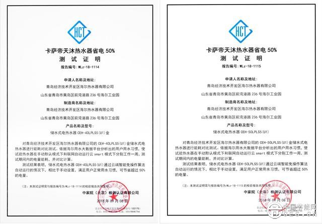 卡薩帝電熱水器天沐PRO及天沐MINI省電證明