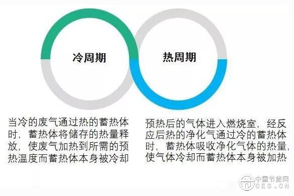 當(dāng)冷的廢氣通過(guò)熱的蓄熱體時(shí),蓄熱體將儲(chǔ)存的熱量釋放,使廢氣加熱到所需的預(yù)熱溫度,此時(shí),蓄熱體本身被冷卻。