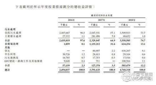 從業(yè)績表現(xiàn)來看,光大水務(wù)的營收及凈利潤在逐年穩(wěn)健增長,2016-2018年,光大水務(wù)分別實(shí)現(xiàn)營收24.94億、35.92億、47.68億港元,復(fù)合增長率為38.27%,其中污水處理業(yè)務(wù)線分別占收入的97.6%、64.9%、74.7%;毛利分別為9.06億、12.3億、16.2億港元;凈利潤分別為3.72億、5.81億、7.37億港元。