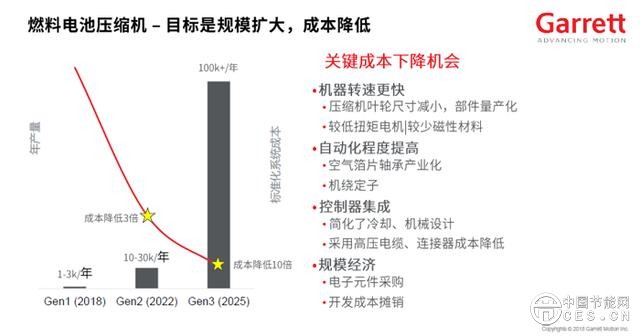 而這同樣意味著,除了技術挑戰(zhàn),氫燃料電池增壓技術亦面臨著來自成本方面的考驗。針對此,Robert Cadle表示,接下來,氫燃料電池電動壓縮機的目標是規(guī)模擴大、成本降低。“預計到2025年之后整個市場的量會達到幾十萬臺的數(shù)量級,而隨著整個市場的擴大,產(chǎn)量上去了,成本也有望隨之降低。屆時我們產(chǎn)品的成本有望降到現(xiàn)在第一代產(chǎn)品的十分之一左右,這有利于燃料電池汽車在后補貼時代的競爭力。”
