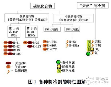 從表2中看出常用的化學(xué)制冷劑(碳氟化合物)對環(huán)保均有負面影響,大氣壽命越長,影響越大。而天然制冷劑CO2、氨、丙烷等在易燃性、成本、能效等方面也存在弱點(見圖1),因此目前還未找到完美的制冷劑。