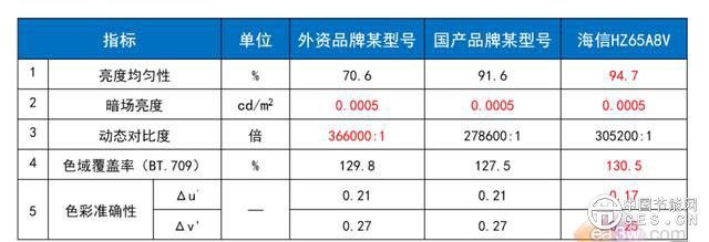 對于海信OLED電視A8的畫面實際表現(xiàn),中國電子技術(shù)標準化研究院從亮度均勻性、暗場亮度、動態(tài)對比度、色域覆蓋率、色彩準確性5個方面與當(dāng)前市場上相同規(guī)格尺寸、相近價格段OLED產(chǎn)品相比。