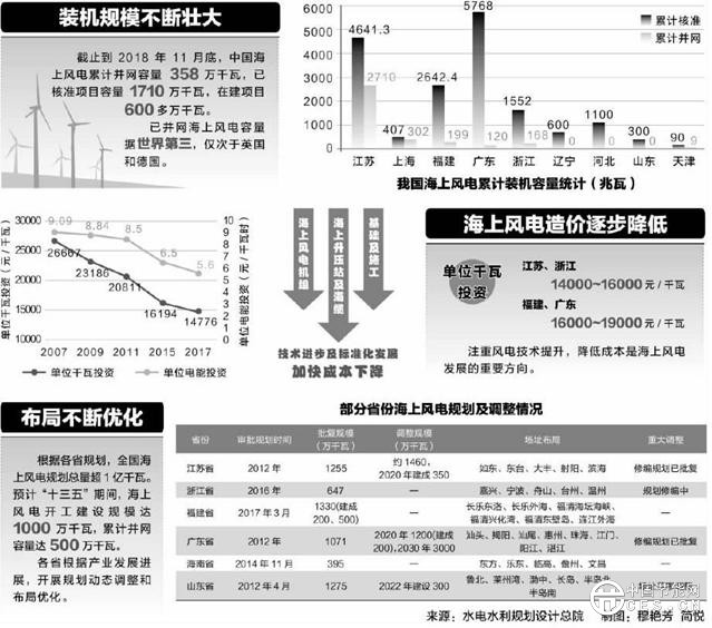 隨著技術(shù)和產(chǎn)業(yè)鏈實(shí)力的持續(xù)進(jìn)步,我國海上風(fēng)電穩(wěn)步推進(jìn)。2018年,海上風(fēng)電新增裝機(jī)容量116萬千瓦,累計(jì)達(dá)到363萬千瓦。水電水利規(guī)劃設(shè)計(jì)總院公布數(shù)據(jù)顯示,我國已并網(wǎng)的海上風(fēng)電容量僅次于英國、德國,居世界第三位。通過建設(shè)典型海上風(fēng)電場,關(guān)鍵技術(shù)取得突破,三峽興化灣300兆瓦海上風(fēng)電場一期、中廣核如東150兆瓦海上風(fēng)電場等有示范意義的海上風(fēng)電場逐個(gè)落成。