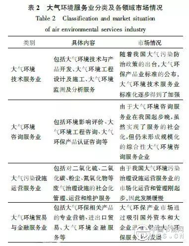 我國(guó)的環(huán)境服務(wù)業(yè)定義為與環(huán)境相關(guān)的服務(wù)貿(mào)易活動(dòng),因而大氣環(huán)境服務(wù)業(yè)就是與大氣環(huán)境相關(guān)的服務(wù)貿(mào)易活動(dòng)。在其發(fā)展初期主要是指提供廢氣處理設(shè)施的服務(wù),隨著需求的增長(zhǎng),大氣環(huán)境服務(wù)業(yè)領(lǐng)域逐漸拓寬,根據(jù)大氣環(huán)境服務(wù)業(yè)的特點(diǎn),其具體涵蓋了原國(guó)家環(huán)境保護(hù)總局在2000年提出的環(huán)境服務(wù)業(yè)的6類中的4類( 表2) ,主要包括大氣環(huán)境技術(shù)服務(wù)業(yè)、大氣環(huán)境咨詢服務(wù)業(yè)、大氣污染設(shè)施運(yùn)營(yíng)服服務(wù)業(yè)、大氣環(huán)境貿(mào)易與金融服務(wù)業(yè)。