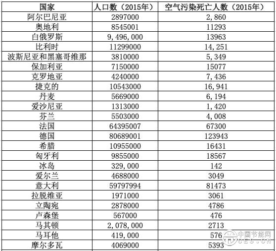 2015年歐洲多個(gè)國家的人口數(shù)及因空氣污染死亡的人數(shù)