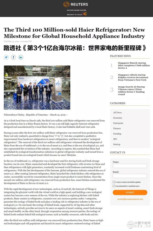 路透社就此第一時(shí)間刊發(fā)了題為《第3個(gè)1億臺(tái)海爾冰箱:世界家電的新里程碑》的專題報(bào)道報(bào)道,文中評(píng)價(jià)海爾第3個(gè)1億臺(tái)冰箱下線“標(biāo)志著其已在世界冰箱業(yè)樹起生態(tài)化變革的里程碑,也是海爾冰箱從產(chǎn)品品牌邁向以用戶生活方式為核心的生態(tài)品牌的標(biāo)志。“
