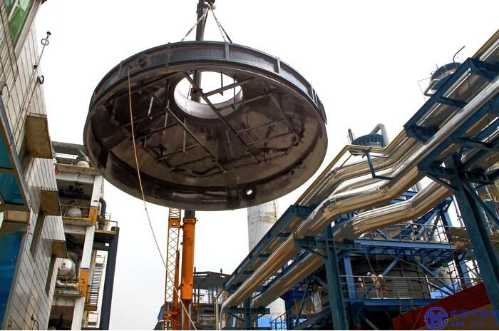 圖為9月3日,綜合脫硫塔首段成功吊裝。