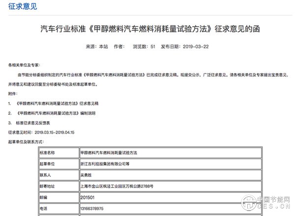 核心提示:近日,全國(guó)汽車(chē)標(biāo)準(zhǔn)化技術(shù)委員會(huì)官網(wǎng)公示了《甲醇燃料汽車(chē)燃料消耗量試驗(yàn)方法》征求意見(jiàn)稿,廣泛征求意見(jiàn)。征詢意見(jiàn)反饋時(shí)間截至到2019年4月15日。