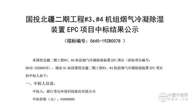 3月25日,中國大氣網(wǎng)了解到,浙江菲達環(huán)保科技股份有限公司中標國投北疆二期工程#3、#4機組煙氣冷凝除濕裝置EPC項目,中標價格為64980000元。