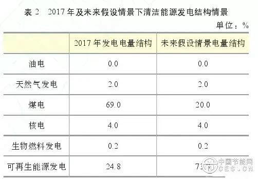 當(dāng)前我國(guó)電源結(jié)構(gòu)仍以化石能源發(fā)電為主,2017年煤電發(fā)電量占總發(fā)電量的69%。作為對(duì)比,本文假設(shè)未來(lái)清潔能源發(fā)電結(jié)構(gòu)下煤電電量占比下降至20%,可再生能源發(fā)電占比提高到73.8%,見(jiàn)表2。