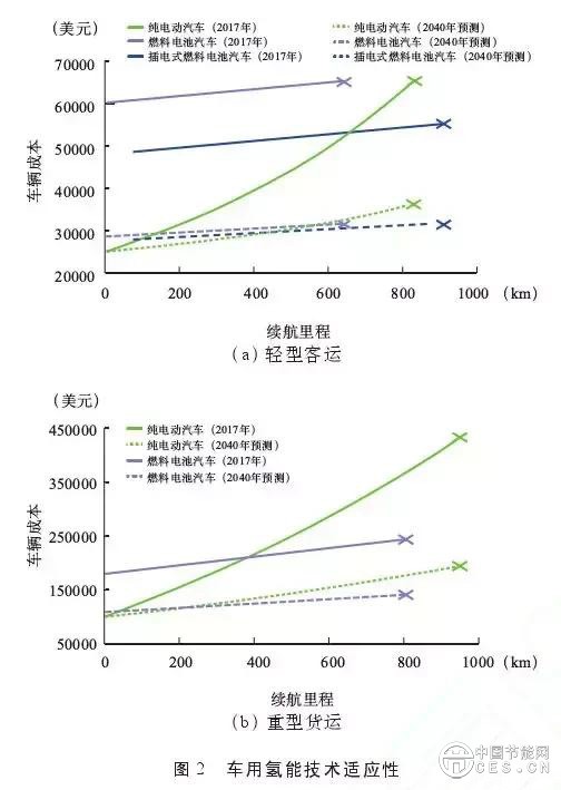 雖然目前氫能以工業(yè)原料消費(fèi)為主,但未來(lái)交通部門應(yīng)用潛力巨大。燃料電池功率和儲(chǔ)能單元彼此獨(dú)立,增加能量單元對(duì)車輛成本和車重影響相對(duì)較小,氫燃料電池在重型交通領(lǐng)域相比鋰電池具有更強(qiáng)的技術(shù)適應(yīng)性。圖 2 為氫燃料電池汽車和純電動(dòng)汽車在輕型客車(圖 2a)和重型貨車(圖2b)應(yīng)用中的成本對(duì)比,可見(jiàn)隨著車重和續(xù)航的提升,燃料電池汽車成本將逐步接近甚至低于純電動(dòng)汽車。