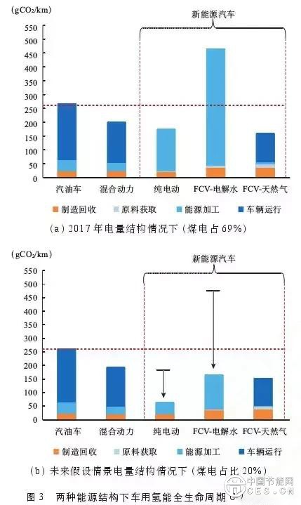 與電能相似,氫能利用的環(huán)境影響取決于上游一次能源結(jié)構(gòu)和下游應(yīng)用場(chǎng)景,其中上游一次能源結(jié)構(gòu)隨著可再生能源占比的提高而動(dòng)態(tài)變化,而氫的能源化利用集中在以燃料電池發(fā)電為主的車用能源和分布式能源場(chǎng)景。因此本文以氫燃料電池汽車為例,分析當(dāng)前和未來(lái)清潔電源情況下,燃料電池汽車的全生命周期排放,并與內(nèi)燃機(jī)汽油汽車、混合動(dòng)力汽車、純電動(dòng)汽車技術(shù)路線進(jìn)行對(duì)比。