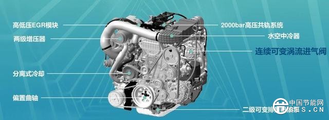 ·具備八大領(lǐng)先技術(shù):采用博世2000bar高壓共軌系統(tǒng),匹配Honeywell雙級(jí)增壓器,具有可變渦流進(jìn)氣閥、高低壓EGR模塊、水冷中冷器、二級(jí)可變排量機(jī)油泵等系統(tǒng)或零部件,應(yīng)用偏置曲軸技術(shù),采用分離式冷卻方式……