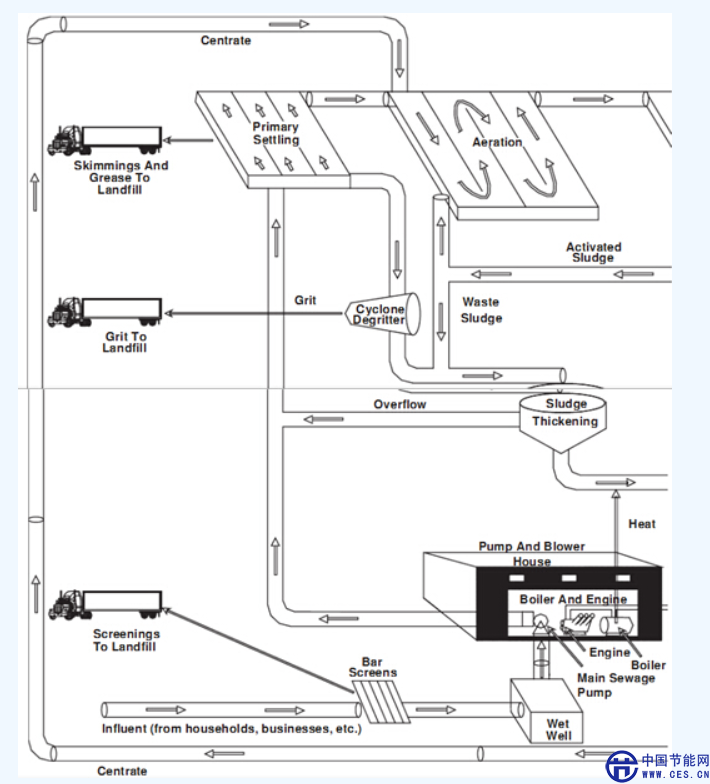 初級污泥通過泵廠的污泥處理設(shè)施進(jìn)行進(jìn)一步的處理。來自主要設(shè)施的部分處理過的廢水流到二次處理系統(tǒng)。
