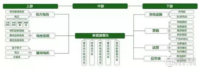 單純從整車角度來看,通常將電動汽車產(chǎn)業(yè)鏈分為動力電池、電控系統(tǒng)、驅(qū)動電機、整車、充電設(shè)施、后市場等環(huán)節(jié)。上游為動力電池、電控系統(tǒng)、驅(qū)動電機;中游為整車環(huán)節(jié);下游為充電設(shè)施、營銷以及后市場環(huán)節(jié)。其中動力電池在成本構(gòu)成中占比最大,將其作為單獨的產(chǎn)業(yè)鏈分析同樣不為過,暫且將其所涵蓋的礦產(chǎn)資源、零部件歸于上游環(huán)節(jié)。