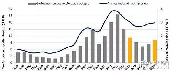 全球有色金屬勘察預(yù)算與年度金屬價(jià)格指數(shù)走勢(shì)圖