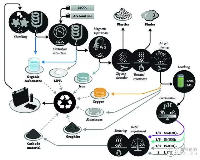 一般來(lái)說(shuō),實(shí)際容量低于初始容量的30%便無(wú)法梯級(jí)利用,目前歐盟主要采用火法冶金-濕法分離提純、熱解-濕法提純、破碎-熱解-蒸餾-火法冶金這幾種工藝提取有用金屬,而國(guó)內(nèi)的鋰電池回收企業(yè)則普遍采用熱解-機(jī)械拆解、物理分選、濕法冶煉這幾種工藝進(jìn)行回收處理。