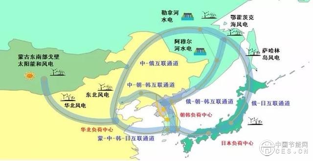 報告指出,構(gòu)建東北亞能源互聯(lián)網(wǎng),總的思路是加快區(qū)內(nèi)清潔能源開發(fā),構(gòu)建環(huán)渤海/北黃海、環(huán)日本海、環(huán)阿穆爾河/黑龍江流域,橫向聯(lián)接蒙古南部至中國華北的“三環(huán)一橫”跨國聯(lián)網(wǎng)通道,形成“西電東送、北電南供、多能互補”的格局。