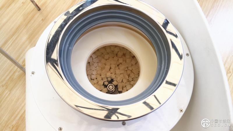 日處理能力僅有幾公斤的家用型濕垃圾機(jī),機(jī)器內(nèi)部的白色顆粒是微生物的“家園”,產(chǎn)品——水和氣可達(dá)標(biāo)排放
