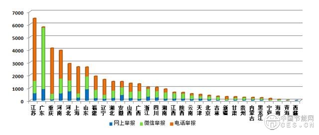 從各地區(qū)不同渠道舉報(bào)數(shù)量看,江蘇、重慶、河南、上海等地電話舉報(bào)量較多,廣東微信舉報(bào)占比達(dá)83.5%。