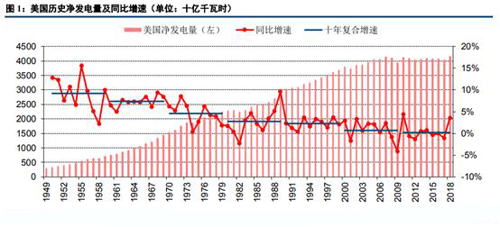 我們首先分析中美歷史發(fā)電量變化情況,以期對(duì)兩國(guó)電力產(chǎn)業(yè)當(dāng)前所處階段做出初步判斷。從美國(guó)近七十年的凈發(fā)電量數(shù)據(jù)來看,盡管年際間發(fā)電增速起伏不定、波動(dòng)較大,但以十年為一個(gè)周期,美國(guó)的凈發(fā)電量復(fù)合增速呈現(xiàn)穩(wěn)步下臺(tái)階的趨勢(shì)。