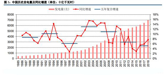 1、對(duì)比美國(guó)歷史七十年發(fā)電量數(shù)據(jù)和中國(guó)歷史35年發(fā)電量數(shù)據(jù)可以看出,近年來美國(guó)發(fā)電量基本無增長(zhǎng),電力工業(yè)處于成熟期;中國(guó)發(fā)電增速面臨換擋,或?qū)@5%這一中樞波動(dòng),有可能正式進(jìn)入穩(wěn)定成長(zhǎng)期,對(duì)標(biāo)美國(guó)70年代到90年代的情況;