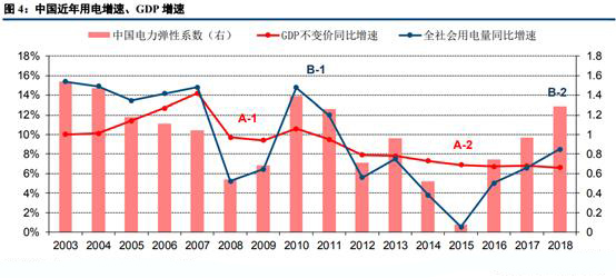 在分析中美當(dāng)前電力工業(yè)發(fā)展分別處于哪一階段之后,我們?cè)偻ㄟ^一系列細(xì)化的發(fā)用電指標(biāo),進(jìn)一步對(duì)比中美電力工業(yè)當(dāng)前發(fā)展的異同。首先從用電量角度出發(fā),觀察中國(guó)近年的GDP增速、用電增速和電力彈性系數(shù)的變化情況。從歷史數(shù)據(jù)來看,中國(guó)用電量在2003年—2011年保持了兩位數(shù)的高增長(zhǎng)(剔除2008年經(jīng)濟(jì)危機(jī)影響),之后用電增速持續(xù)回落,至2015年后觸底回升。整體來看,我國(guó)GDP增速與用電增速趨勢(shì)較為同步,用電增速波動(dòng)幅度相對(duì)較大。從電力彈性系數(shù)的角度分析,當(dāng)經(jīng)濟(jì)增速下滑時(shí),用電增速下滑幅度往往大于GDP增速,導(dǎo)致電力彈性系數(shù)偏小(A-1、A-2兩階段);當(dāng)經(jīng)濟(jì)有所回暖時(shí),用電增速的反彈幅度同樣大于GDP增速,導(dǎo)致電力彈性系數(shù)偏大(B-1、B-2兩階段)。我們判斷我國(guó)用電增速波動(dòng)大的主要原因在于第二產(chǎn)業(yè)用電占比較高且二產(chǎn)對(duì)于經(jīng)濟(jì)增長(zhǎng)更為敏感。
