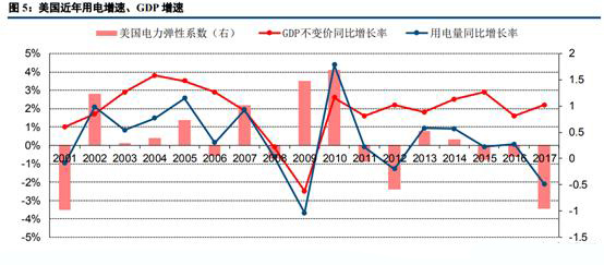 從美國(guó)的GDP增速、用電增速和電力彈性系數(shù)的變化情況來看,美國(guó)作為發(fā)達(dá)國(guó)家,其經(jīng)濟(jì)增長(zhǎng)與用電增速相對(duì)較為穩(wěn)定,波動(dòng)幅度遠(yuǎn)小于中國(guó)。2011年以來,美國(guó)GDP增速保持2%左右波動(dòng),而用電增速在±1%的區(qū)間內(nèi)窄幅震蕩,用電量增長(zhǎng)和經(jīng)濟(jì)增長(zhǎng)基本沒有明顯相關(guān)性。從電力彈性系數(shù)也看出,美國(guó)電力彈性系數(shù)較為無序,預(yù)示其經(jīng)濟(jì)增長(zhǎng)對(duì)電力消費(fèi)推動(dòng)的影響明顯減小。