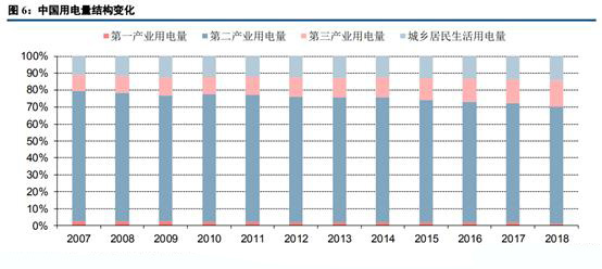接下來我們對(duì)比分析中美用電量結(jié)構(gòu)情況。2018年我國(guó)全社會(huì)用電量為68449億千瓦時(shí),同比增長(zhǎng)8.49%;第二產(chǎn)業(yè)用電量為47235億千瓦時(shí),同比增長(zhǎng)7.17%。從我國(guó)近十年來的用電結(jié)構(gòu)變化來看,第二產(chǎn)業(yè)用電占比由80%下滑到70%左右,其釋放出的用電空間主要由第三產(chǎn)業(yè)用電及城鄉(xiāng)居民生活用電瓜分。未來隨著我國(guó)經(jīng)濟(jì)結(jié)構(gòu)持續(xù)轉(zhuǎn)型,高耗能產(chǎn)業(yè)對(duì)用電增長(zhǎng)的拉動(dòng)效應(yīng)有望逐步弱化,第二產(chǎn)業(yè)用電占比仍將持續(xù)小幅下降。