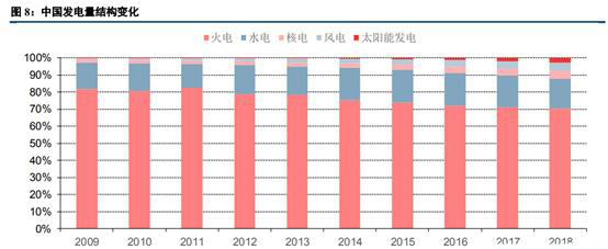 接下來我們從發(fā)電量及電力裝機(jī)結(jié)構(gòu)等角度對(duì)比中美電力供應(yīng)側(cè)的不同。2018年中國(guó)火電發(fā)電量為49231億千瓦時(shí),同比增長(zhǎng)7.3%(中電聯(lián)口徑,與統(tǒng)計(jì)局口徑范圍不同),占總發(fā)電量比重為70.4%。雖然火電仍然為最主要的發(fā)電電源,但其占比已從2009年的81.8%下滑了11.4個(gè)百分點(diǎn)。水電發(fā)電量受氣候因素影響存在一定波動(dòng),占比相對(duì)較為穩(wěn)定。核電、風(fēng)電、太陽(yáng)能等新能源發(fā)電增速及發(fā)電占比提升較快,對(duì)火電的替代效應(yīng)十分明顯。