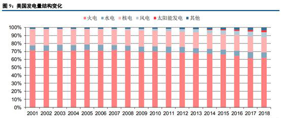 美國(guó)發(fā)電量結(jié)構(gòu)變化情況與中國(guó)較為類似,火電發(fā)電量占比從2001年的71.7%下降到2018年的62.1%。核電、水電分別是美國(guó)的第二和第三大發(fā)電電源,兩者占比相對(duì)穩(wěn)定。風(fēng)電及太陽(yáng)能對(duì)火電的替代效應(yīng)較為明顯。中美發(fā)電量數(shù)據(jù)的不同之處在于美國(guó)火電及核電發(fā)電量多年來幾乎維持零增長(zhǎng),風(fēng)電及太陽(yáng)能以搶占少量的新增用電需求為主;而中國(guó)各項(xiàng)電源占比結(jié)構(gòu)雖然有所分化,但各類電源發(fā)電量仍然維持正增長(zhǎng)。