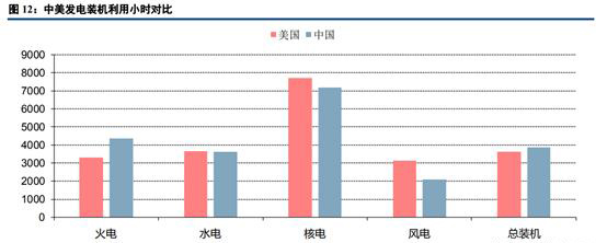 從中美發(fā)電裝機(jī)利用小時(shí)對(duì)比來看,由于美國(guó)火電裝機(jī)中燃機(jī)占比較高,所以其總裝機(jī)利用小時(shí)和火電利用小時(shí)均低于中國(guó)。其核電及風(fēng)電受益于消納條件較好及資源稟賦,利用小時(shí)高于中國(guó)。