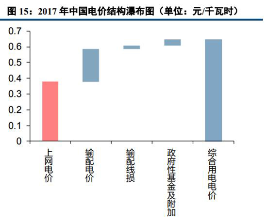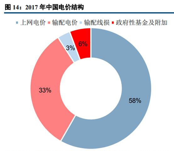我國(guó)銷售電價(jià)構(gòu)成主要包括上網(wǎng)電價(jià)、輸配電價(jià)、輸配線損和政府性基金及附加。根據(jù)發(fā)改委2017年電力價(jià)格監(jiān)管相關(guān)通告數(shù)據(jù),電網(wǎng)企業(yè)平均含稅銷售電價(jià)為0.6091元/千瓦時(shí)(不含政府性基金及附加)。對(duì)于下游用戶綜合用電電價(jià)而言,其由發(fā)電企業(yè)上網(wǎng)電價(jià)(0.3763元/千瓦時(shí))、輸配電價(jià)(0.2107元/千瓦時(shí))、輸配電線損(0.02213元/千瓦時(shí))和政府性基金及附加(0.0366元/千瓦時(shí)),合計(jì)為0.6457元/千瓦時(shí)。從占比來看,上網(wǎng)電價(jià)、輸配電價(jià)、輸配線損和政府性基金及附加占比分別為58%、33%、3%和6%。
