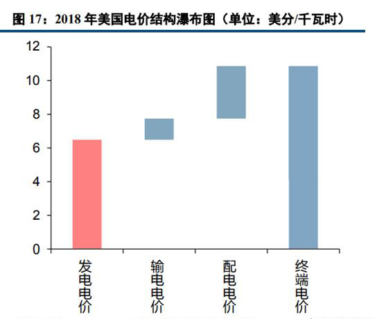 而美國(guó)的銷售電價(jià)主要由發(fā)電電價(jià)、輸電電價(jià)以及配電電價(jià)構(gòu)成。2018年美國(guó)終端用電價(jià)格為10.85美分/千瓦時(shí),其由上網(wǎng)電價(jià)(6.49美分/千瓦時(shí))、輸電電價(jià)(1.24美分/千瓦時(shí))和配電電價(jià)(3.12美分/千瓦時(shí))構(gòu)成,三者占比分別為60%、11%和29%。