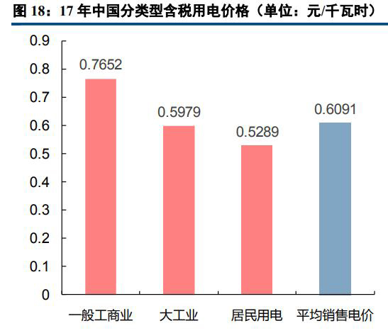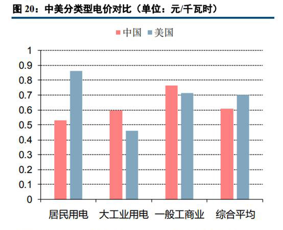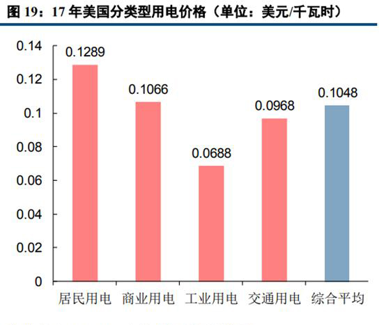 從2017年分類型用電價(jià)格的數(shù)據(jù)來看,中美電價(jià)水平整體較為接近,但美國(guó)居民用電價(jià)格大幅高于中國(guó)。我國(guó)一般工商業(yè)的平均用電電價(jià)較高,為0.76524元/千瓦時(shí),大工業(yè)和居民用電的平均電價(jià)分別為0.59785元/千瓦時(shí)和0.52894元/千瓦時(shí)。而美國(guó)平均用電價(jià)格最高的用戶類型為居民用電,為0.1289美元/千瓦時(shí),商業(yè)用電、交通用電和工業(yè)的平均電價(jià)則相對(duì)較低,分別為0.1066、0.0968和0.0688美元/千瓦時(shí)(數(shù)據(jù)來自于EIA,各地州政府或有少量稅費(fèi))。