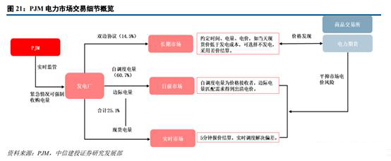 事實(shí)上PJM整合了PX(電力交易商)和獨(dú)立系統(tǒng)運(yùn)營(yíng)商(ISO)的角色,采用著名的節(jié)點(diǎn)邊際價(jià)格LMP來制定電力市場(chǎng)化交易價(jià)格。從交易品種來劃分,PJM包括電量市場(chǎng)、容量市場(chǎng)、輔助服務(wù)市場(chǎng)和金融輸電權(quán)市場(chǎng);從交易時(shí)限來劃分,可以分為長(zhǎng)期市場(chǎng)、日前市場(chǎng)和實(shí)時(shí)市場(chǎng)(現(xiàn)貨交易)。需要注意的是,PJM自身不提供電力期貨交易,主要是相關(guān)商品交易所(紐約商業(yè)交易所、洲際交易所)等將非標(biāo)準(zhǔn)化的場(chǎng)外交易合約按照期貨交易機(jī)制進(jìn)行標(biāo)準(zhǔn)化改造,推出電力期貨合約。目前,美國(guó)、歐洲和澳大利亞均有區(qū)域性電力期貨交易上市。