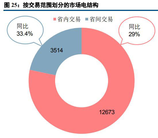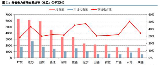 從分省電力市場(chǎng)交易細(xì)節(jié)來看,市場(chǎng)交易電量占全社會(huì)用電量比重較高省份主要有云南(50.7%)、遼寧(47.6%)、蒙西(45.3%)和江蘇(43.4%)。市場(chǎng)電量絕對(duì)值較高的省份包括江蘇(2657億千瓦時(shí))、廣東(1805億千瓦時(shí))、山東(1783億千瓦時(shí))、浙江(1470億千瓦時(shí))、蒙西(1256億千瓦時(shí))、遼寧(1097億千瓦時(shí))和河南(1080億千瓦時(shí))。