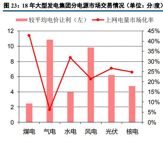 2018年大型發(fā)電集團(tuán)上網(wǎng)電量合計(jì)36587億千瓦時(shí),同比增長(zhǎng)11%;其市場(chǎng)交易電量合計(jì)13713億千瓦時(shí)(不含發(fā)電權(quán)交易),同比增長(zhǎng)26.4%,占大型發(fā)電集團(tuán)合計(jì)上網(wǎng)電量的37.5%,較上年提高4.5個(gè)百分點(diǎn)。從分電源情況來看,煤電機(jī)組上網(wǎng)電量市場(chǎng)化率最高,達(dá)42.8%,市場(chǎng)電較平均電價(jià)讓利為2.45分/千瓦時(shí);水電上網(wǎng)電量市場(chǎng)化率排名第二,達(dá)31.9%,市場(chǎng)電較平均電價(jià)讓利為3.96分/千瓦時(shí)。風(fēng)電、氣電等電源市場(chǎng)化率相對(duì)較低,對(duì)應(yīng)度電讓利較高。